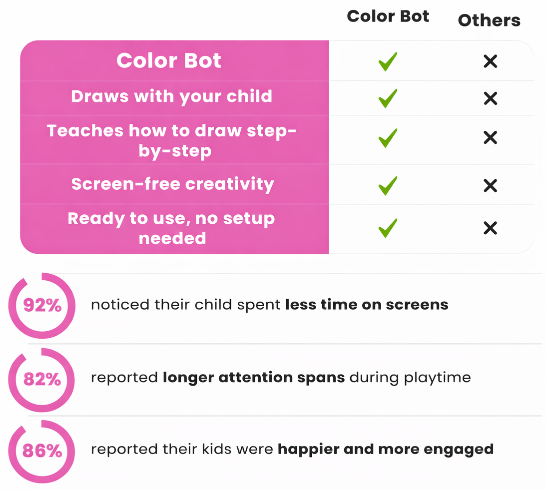 Doodle Bot makes drawing fun, interactive, and educational -no tablets, apps, or Wi-Fi needed. It's hands-on creativity that keeps kids engaged, builds real skills, and gives parents peace of mind.