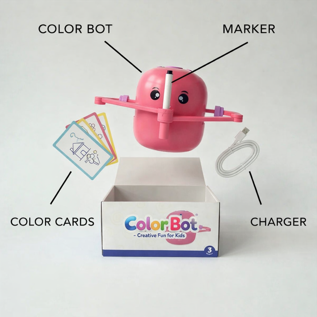 Color Bot is the fun, interactive robot that helps kids learn to draw - step by step. It draws alongside your child, turning simple shapes into real artwork while building confidence, focus, and creativity.